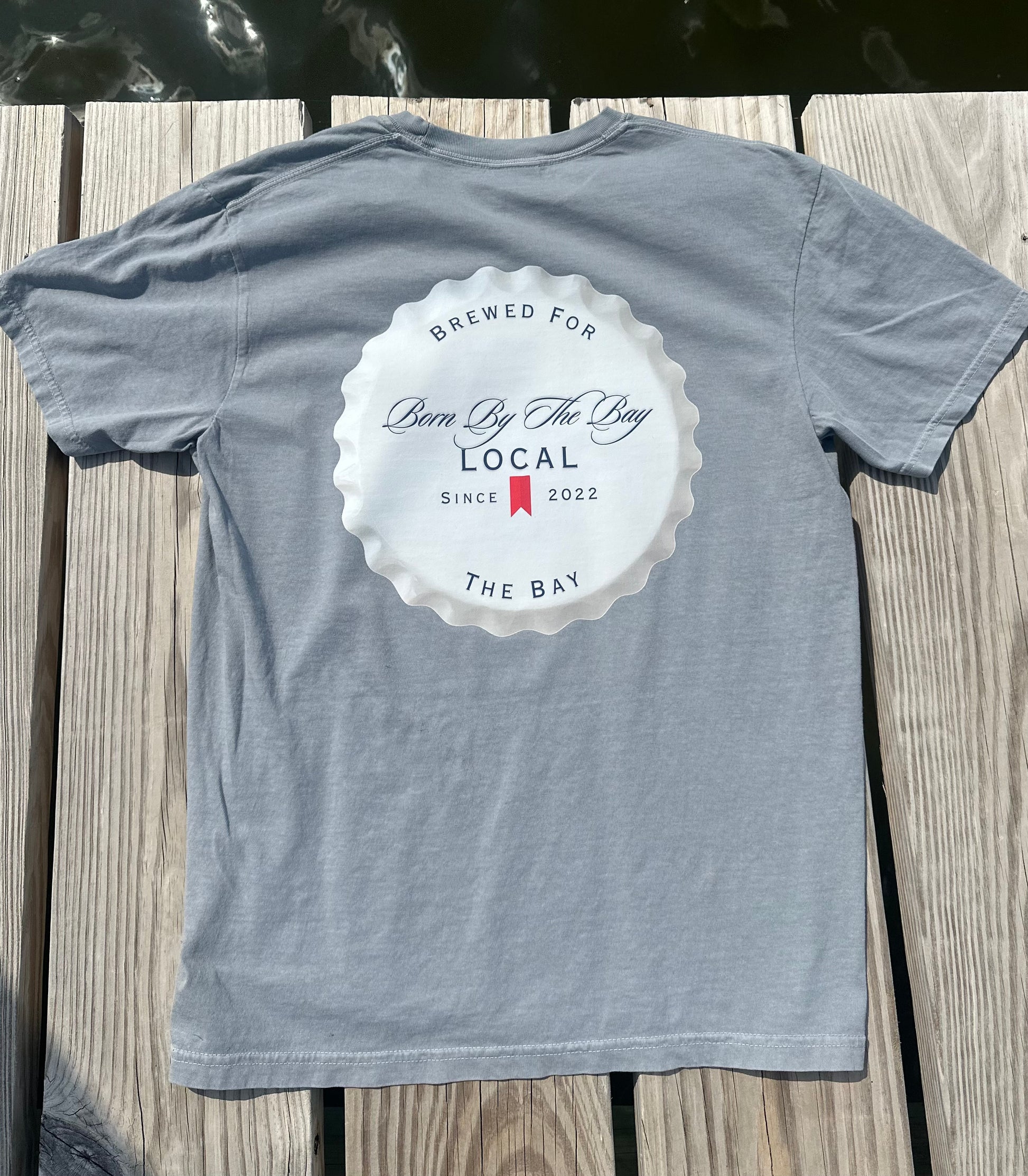 The Born By The Bay Beer Cap Tee features the Born By The Bay large bottle cap design on the back. The perfect tee for relaxing in a cove or on a beach by the bay!